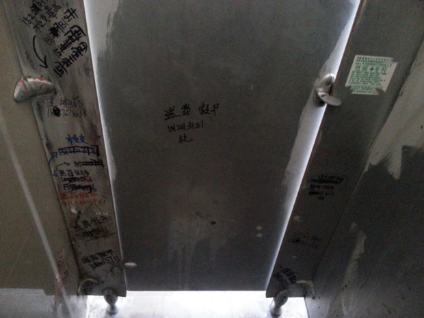 One summer day, I was that traveler, and ever since I have been an avid consumer of Chinese bathroom graffiti. This summer, I have checked every available stall in each public restroom I’ve entered to read and photograph the messages that are scrawled there. The click of my camera phone has raised a few eyebrows among patrons and cleaning staff, but I have persevered in order to answer those questions inspired by the toilet door in Qujing—what are Chinese men writing about on bathroom walls? Just how common is dissenting political commentary? What other “conversations” are taking place?