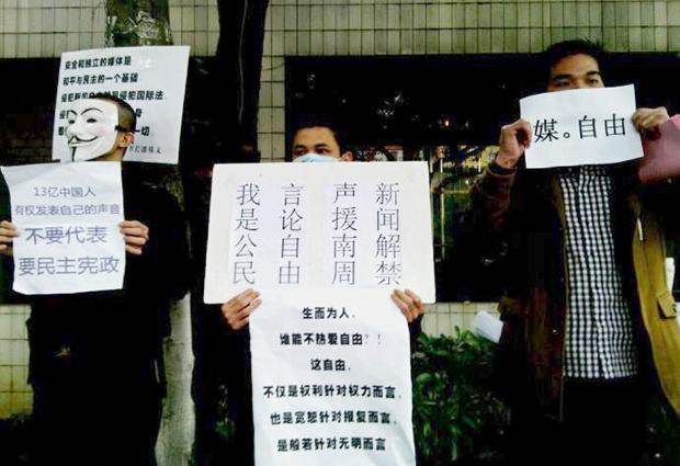 Online action has translated into real-life protest. On Monday, hundreds of supporters held rallies outside of Southern Weekend’s headquarters in Guangzhou, many bearing chrysanthemums, a flower believed to be able to endure harsh climates. Many were not afraid to show their faces while holding up signs and placards calling for freedom of press. Indeed, one girl held up two fingers in a victory sign as the police took photos of her, presumably as evidence for potential prosecution in the future.