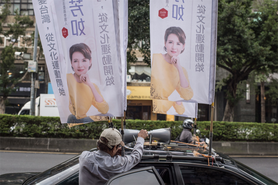 Tseng Po-yu walks along the narrow sidewalks made dim by the overhead awnings, between the bank of parked motorbikes on one side and the one-room shops and restaurants on the other. Wearing the brightly colored vest of a Taiwanese candidate for public office, into these shops and restaurants she ventures, bowing to the customers and shopkeepers, offering each person a packet of Kleenex with her photograph on it and explaining that she, a member of the Green Party in New Taipei City’s 11th district, would appreciate their vote for national legislature. Most pocket the free tissues and turn back to whatever they are doing. Only a very few offer the encouragement given by one vendor: “Give me some more packets, I’ll help you with publicity,” she says, piling them next to the sweaters she is selling. Tseng bows, her shoulder-length dark-brown hair falling over her face. “Women supporting women! Thank you!” She and her team of four young assistants move on.