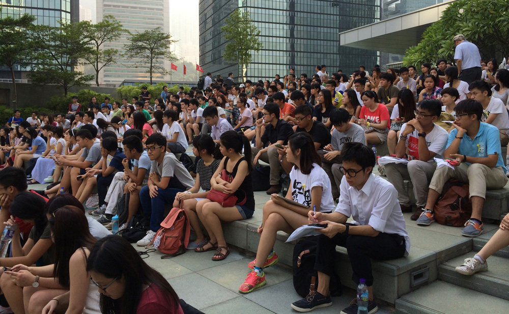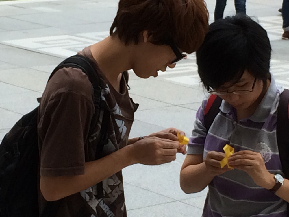A week ago today I sat together with you outside the Chinese University of Hong Kong’s library, a teacher among other teachers, a university member beside students, 13,000 strong. The weeks before had felt quiet: at the three previous all-student meetings around the Goddess of Democracy statue, you listened respectfully to guest speakers—past student union presidents, a student who had been arrested on July 1, Leung “Longhair” Kwok-hung from the League of Social Democrats. There were not many of you, but you raised your hands and made gentle suggestions about what time last Monday’s rally should start, about how you could be photographed studying outside of class, about making public art by folding paper stars.