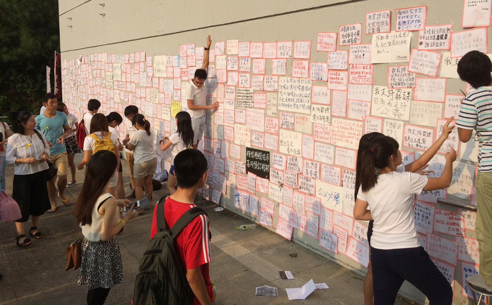 So I was surprised when I arrived at the campus plaza on Monday. Under a relentless late summer sun, you filled the entire campus mall. On the impromptu stage, white banners read, “Student Boycott, Take a Stand!” and “Be the master of Hong Kong’s future!” Throughout the afternoon a “Democracy Wall” rose at the far end of the crowd; some of the messages you attached to it simply gave support for the strike and Hong Kong’s democracy, some of you filled poster-boards to the brim with righteous indignation: “The National People’s Congress has seized our right to universal suffrage…you are not the emperor!” You bore brightly-colored flags that bobbed in the sunlight, representing your universities, your departments. The atmosphere was ebullient. You cheered and waved when a photography drone passed overhead. You chanted slogans with yellow ribbons tied around your wrists. You sang songs with your arms in the air.