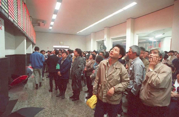 To impose some semblance of order upon this ad hoc trading network, in 1986 Beijing authorized the Manchurian city of Shenyang to set up China’s first “stock market.” The name sounded grandiose, but this initial “exchange” was really only a single cashier’s window in a local bank office where the prices of a few fixed-interest, government-approved bonds were listed on a blackboard hanging on the wall. Next, the cities of Beijing, Wuhan, Tianjin, Canton, Chongqing, Guangzhou, Harbin and Shenzhen received permission to set up their own local markets, and with little prompting, hordes of small investors flocked to take advantage of what seemed like high rates of return compared with the relatively low interest rates derived from bank savings accounts.