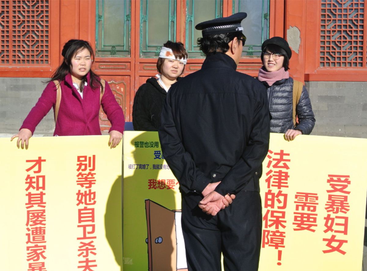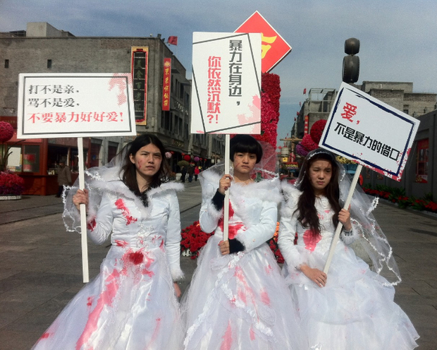 On Valentine’s Day 2012, under the direction of Feminist Voices, a group of young activists organized a public event at the Beijing City Center. The purpose was to call for the passage of anti-domestic violence laws—there were none on the books—and the theme was “injured bride.” Dressed in white wedding gowns with fake blood smeared on the front, women walked through downtown Beijing holding signs that read “Violence Is Not Love” and “Hitting Is Not Intimacy.”