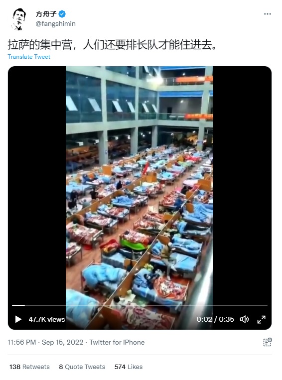 As officials in Lhasa strive to fulfill the zero-COVID goal, they have shipped thousands of Tibetans, as well as Han Chinese, Chinese Muslims, and other members of China’s minority groups (and at least one foreigner) to these isolation fangcang. Conditions in them vary widely. Official videos show people in Lhasa dancing in private rooms with food delivered to their doors in hotels that have been requisitioned to serve as centralized isolation points, and a number of private reports describe smaller isolation fangcang—usually ones with separate rooms for occupants—with ample staff, space, and provisions.